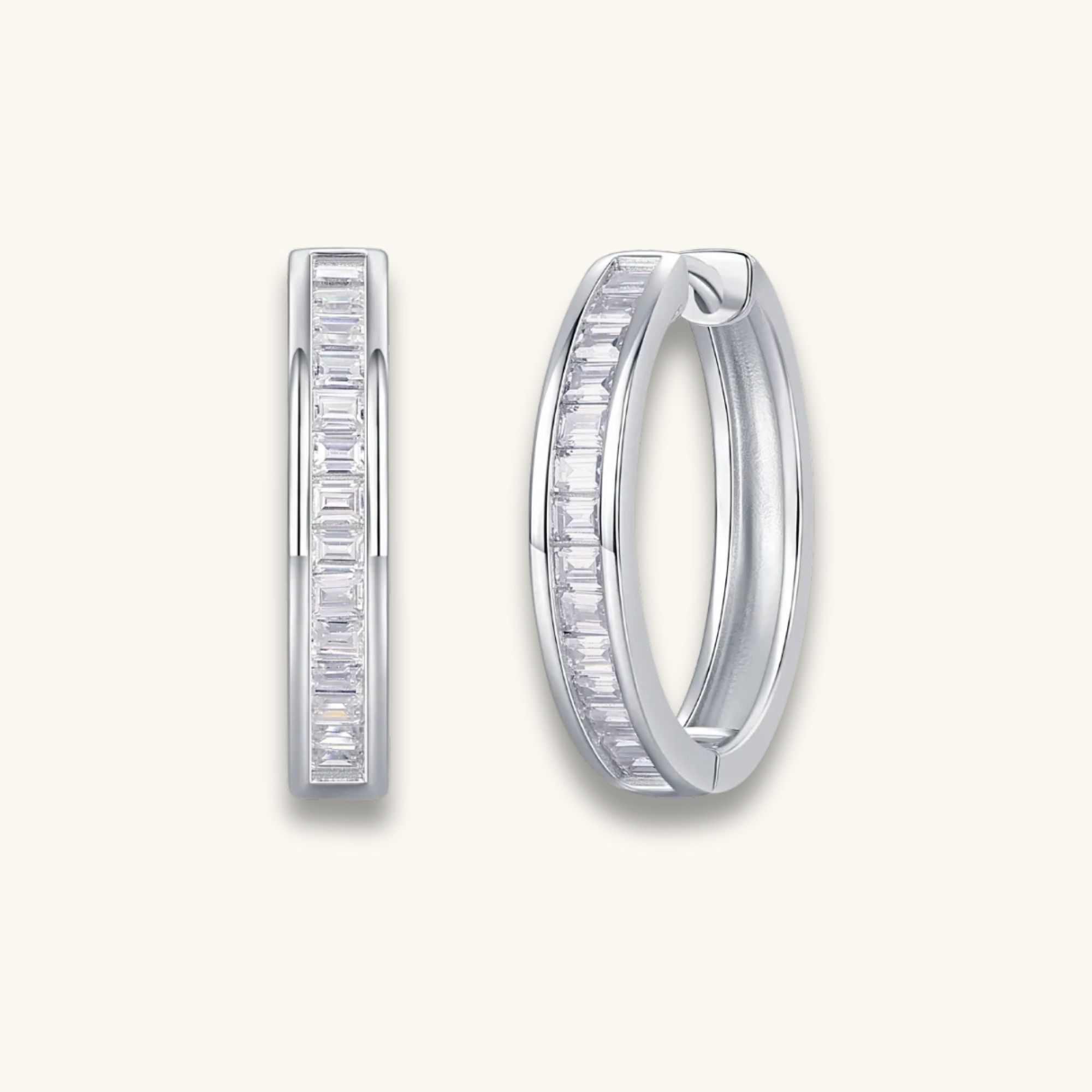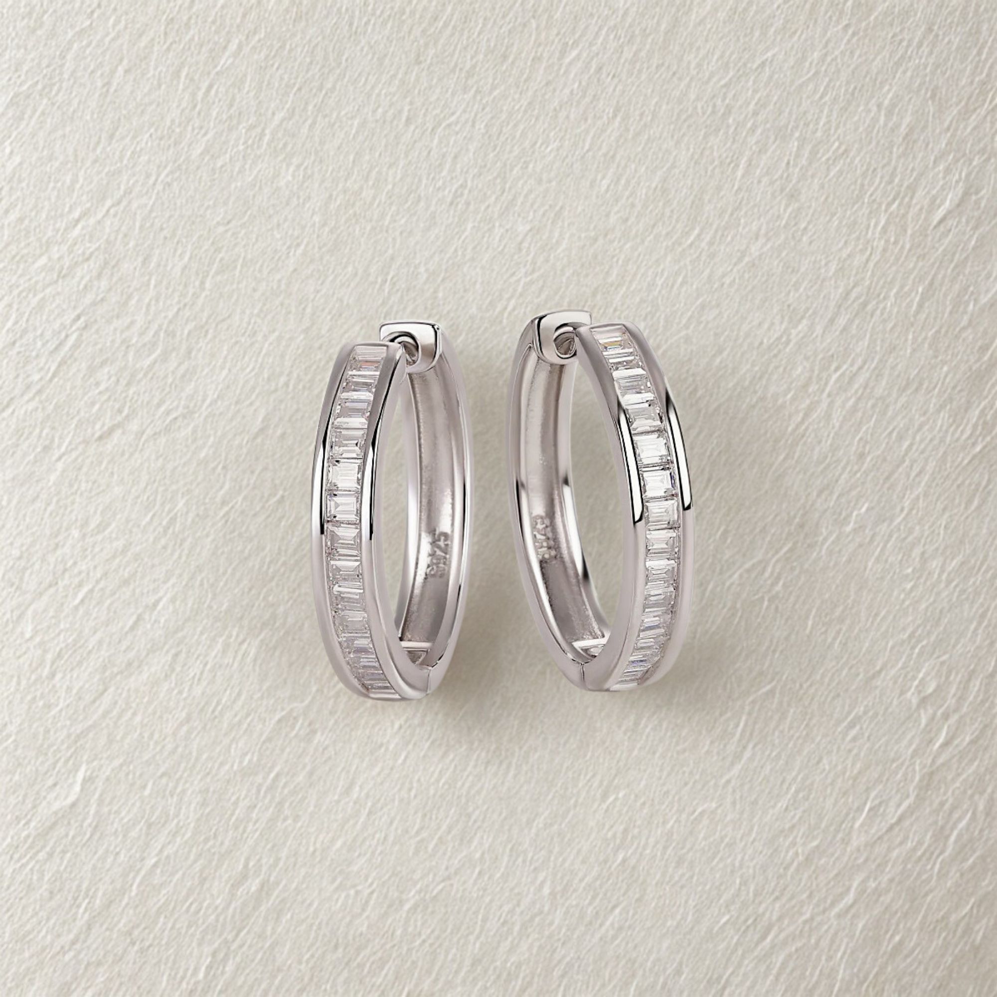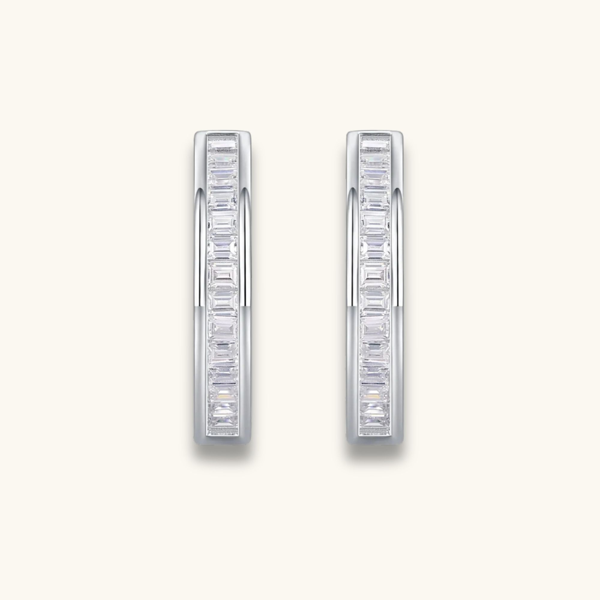 Rectangular moissanite stones align in silver, each facet reflecting a linear brilliance. Sculpted for those who savor simplicity, these hoops are a quiet celebration of clarity and modern grace.
